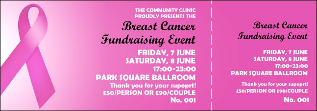If you're working toward a cure, selling tickets for charity events can really help. The Pink Ribbon General Admission Ticket, printed with the breast cancer awareness emblem, helps you raise money for research, education and prevention.